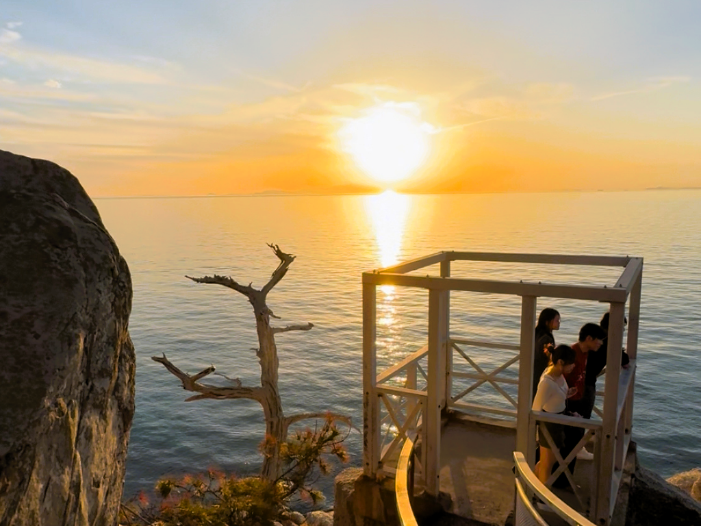 最近リニューアル工事が行われきれいな芝生でおおわれた海水浴場。 夕日が抜群にきれいで海水浴シーズン以外でも憩いの場としてにぎわっています。神蔵から約5㎞。車で7分